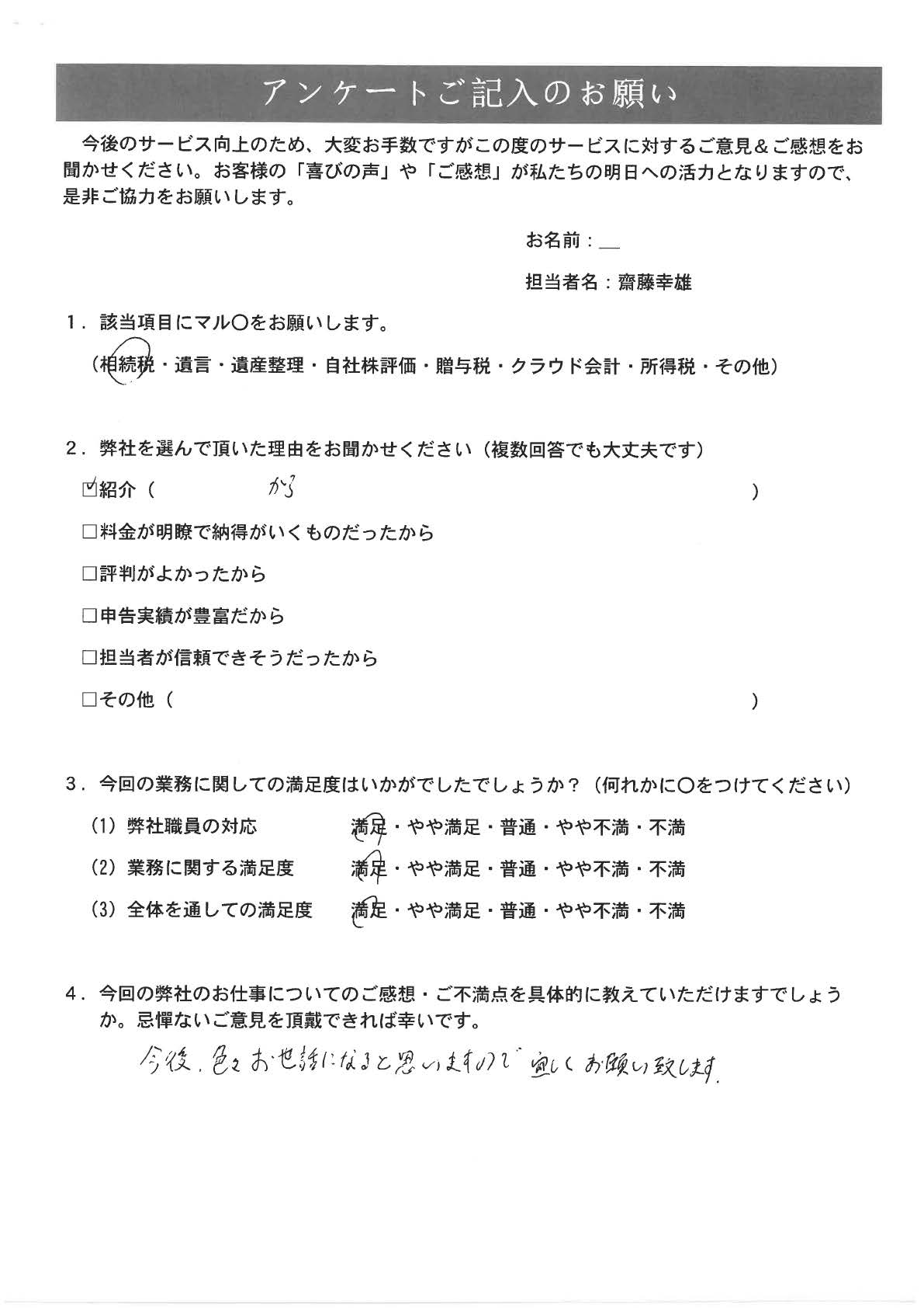 東京 60代・女性(No.0039) 2026年03月04日 担当事務所 齋藤幸雄税理士事務所 担当者 齋藤幸雄 弊社を選んだ理由 紹介 お客様の声 適切で素早い対応をしていただき助かっております。 またよろしくお願い致します。 齋藤幸雄税理士事務所:齋藤幸雄 私が担当いたしました。