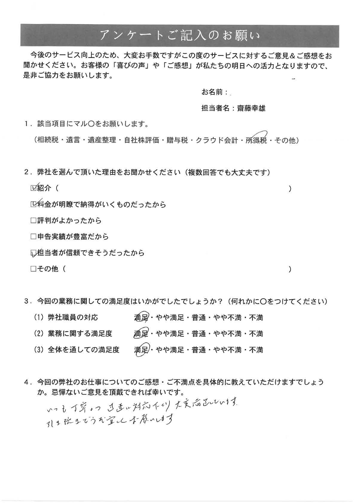 東京 70代・女性(No.0045) 2026年03月04日 担当事務所 齋藤幸雄税理士事務所 担当者 齋藤幸雄 弊社を選んだ理由 紹介(証券会社) 齋藤幸雄税理士事務所:齋藤幸雄 私が担当いたしました。